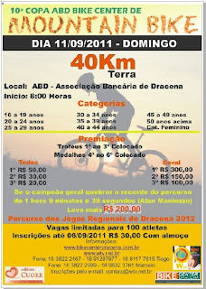 No próximo domingo será realizada a 10ª Copa ABD MTB emDracena/SP. Uma prova tradicional com organização Bike Center Dracena/Marcelo,mais de R$1.700,00 em prêmios estão em disputa. A competição promete fortes disputas, estão confirmadas ciclistasda cidades: Adamantina,Dracena, Epitacio, Bataguassu, Rancharia, Prudente, Araçatuba, Guararapes,Marilia, Martinopolis,Tupi Paulista E Junqueiropoles. As vagas são LIMITADAS , faça já sua inscrição aqui . Com premiação em dinheiro para todas as categorias a provatem uma premiação especial para o ciclista que completar os 40km de prova, comtempo abaixo de 1h09:39, do ciclista Alan Maniezzo. Para os ciclistas que disputam jogos regionais o percurso daprova de domingo, será o mesmo dos Jogos Regionais 2012
